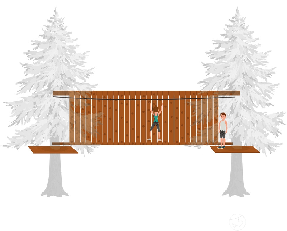 安装在两根方形梁或电缆上。由樟子松木制成。 板块尺寸:20厘米 x 250厘米。 攀岩墙长度:定制,每1米长度配备9个攀岩架。